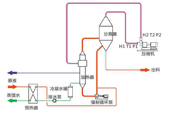 MVR蒸發(fā)器采用壓縮機提高二次蒸汽的能量,并對提高能量的二次蒸...